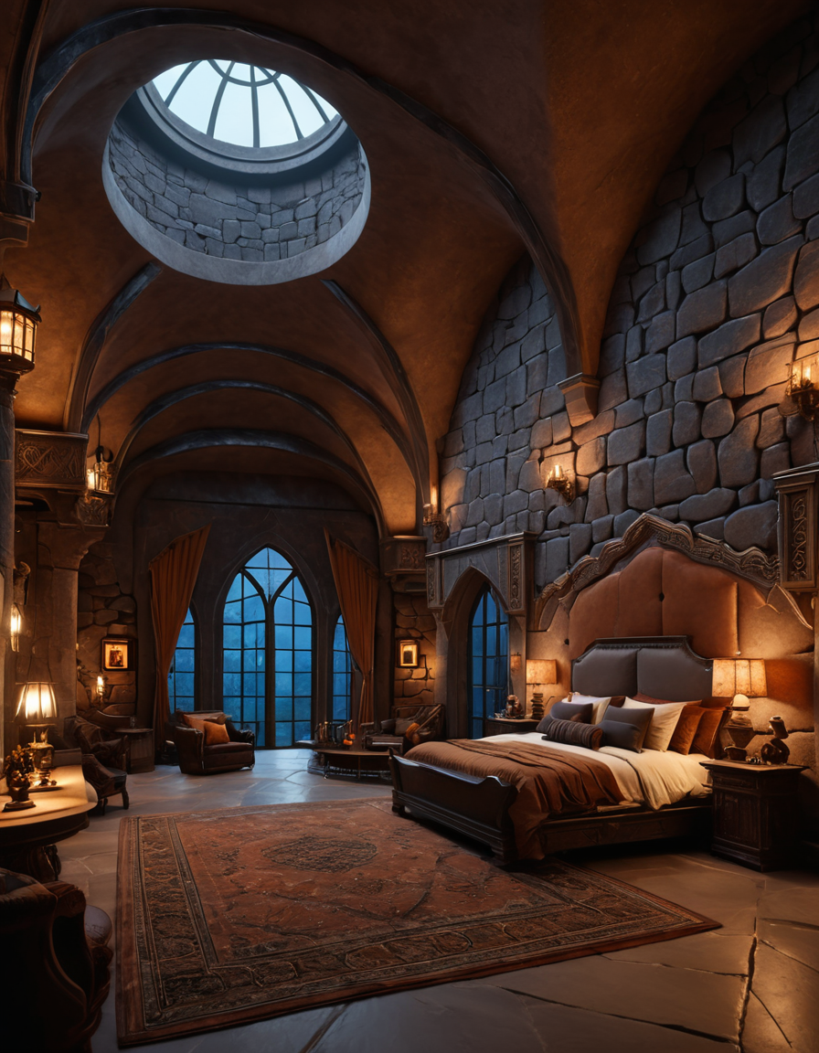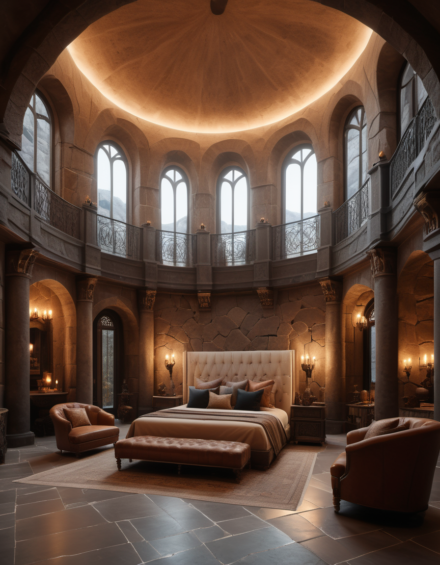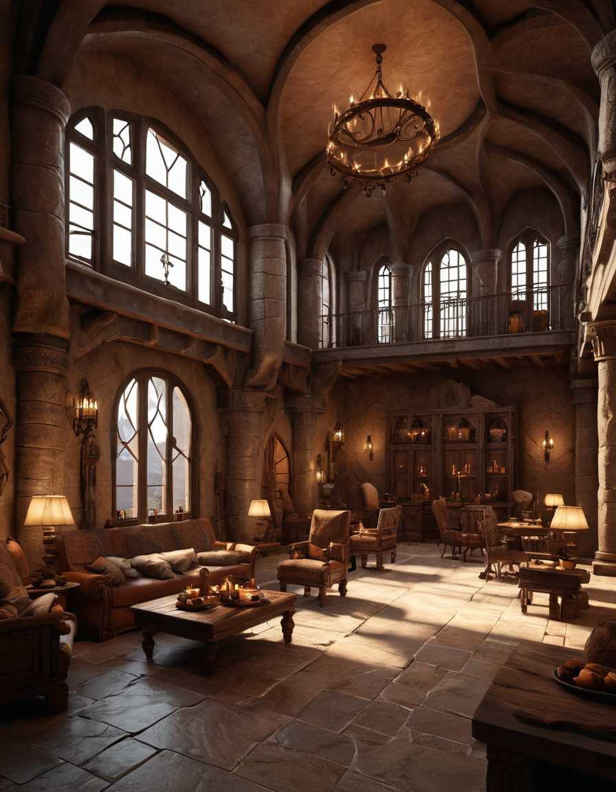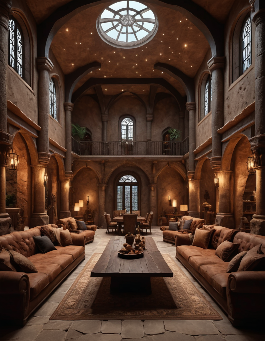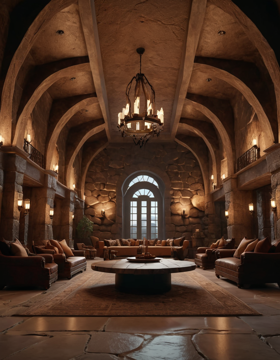 Innen entfaltet sich ein Reich von beinahe häuslicher Majestät. Große Hallen öffnen sich in sanften Übergängen zu Nischen, Kammern und stillen Gärten im Fels. Überall liegen Felle – weich, warm, einladend. Die Möbel sind gepolstert, farbig, von Hand gefertigt, mit Liebe und mit Sinn für das Verspielte. Der Schöpfer kommt oft hierher, nicht um zu herrschen, sondern um zu verweilen. Er liebt die Gemütlichkeit, das Lachen am Spieltisch, die Kartenrunden, das Knistern der Feuerstellen.