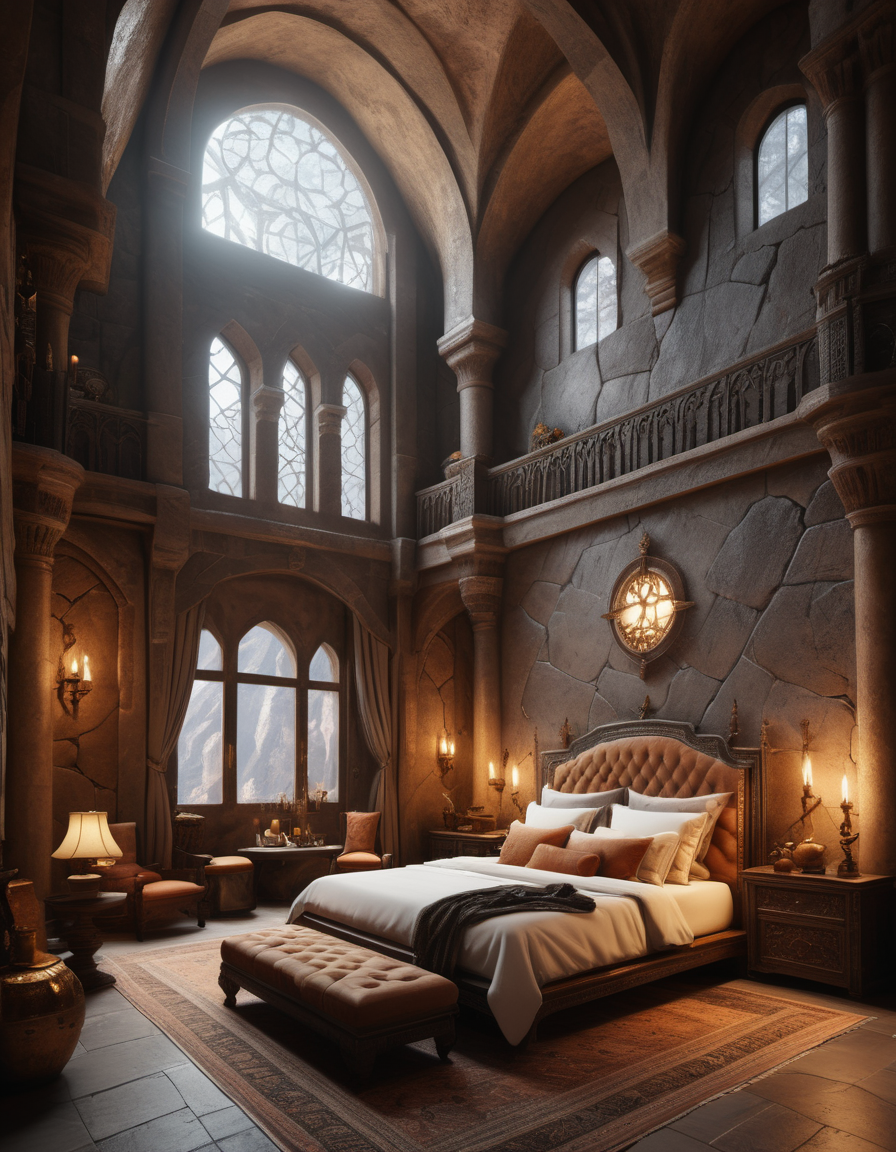 Das Licht ist sanft und dennoch hell genug, um die Dunkelheit der Tiefe zu vergessen. Magische Lampen hängen von den Decken, in Form von Kristallen, die wie gefangenes Morgenlicht strahlen. Fenster aus besonderen Steinen fangen das Sonnenlicht ein und schicken es in die Höhlen, als wäre es nie fern. Das Spiel von Schatten und Glanz ist lebendig – es tanzt mit den Stimmen, die sich im Palast verlieren, und mit den Gedanken, die hier zur Ruhe kommen.